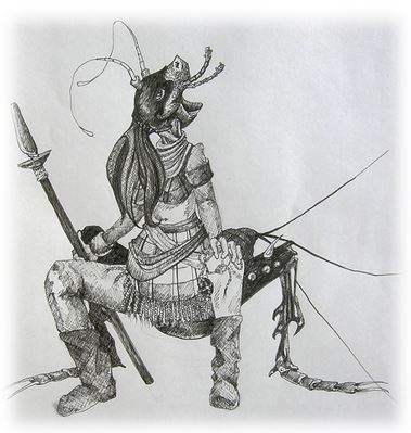 Although slight of build when compared to Humans, the Praeops are strong and very fast. Their faces are long, narrow, and covered in scaly plates. The warriors among them also have natural armor in the form of a thin exoskeleton that covers most of the body. The queens are more insectival in appearance than the rest of the species, with segmented, puffy abdomens that are supported by an extra pair of legs. The Praeops adhere to a rigid social pyramid, with the Herder Thractis at the top and the queens just underneath. Their largest underground hive, the Naktix, is the where nearly all of them live and die.